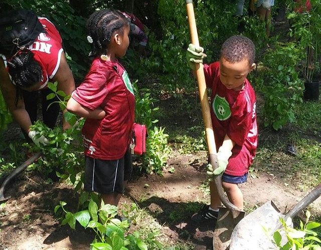As the vibrant sunlight shone brilliantly on calm waters of the Bronx River, it traveled up to the south-end bank of shoelace park, T.O.P Soccer’s designated planting area. Approximately, 40 patrons, some as young as three years old, were in attendance with brown spades and white garden gloves. Families, friends, children and Bronx River Alliance staff were all hands-on deck, ready to take on the collaborative task of planting a whopping 124 saplings.